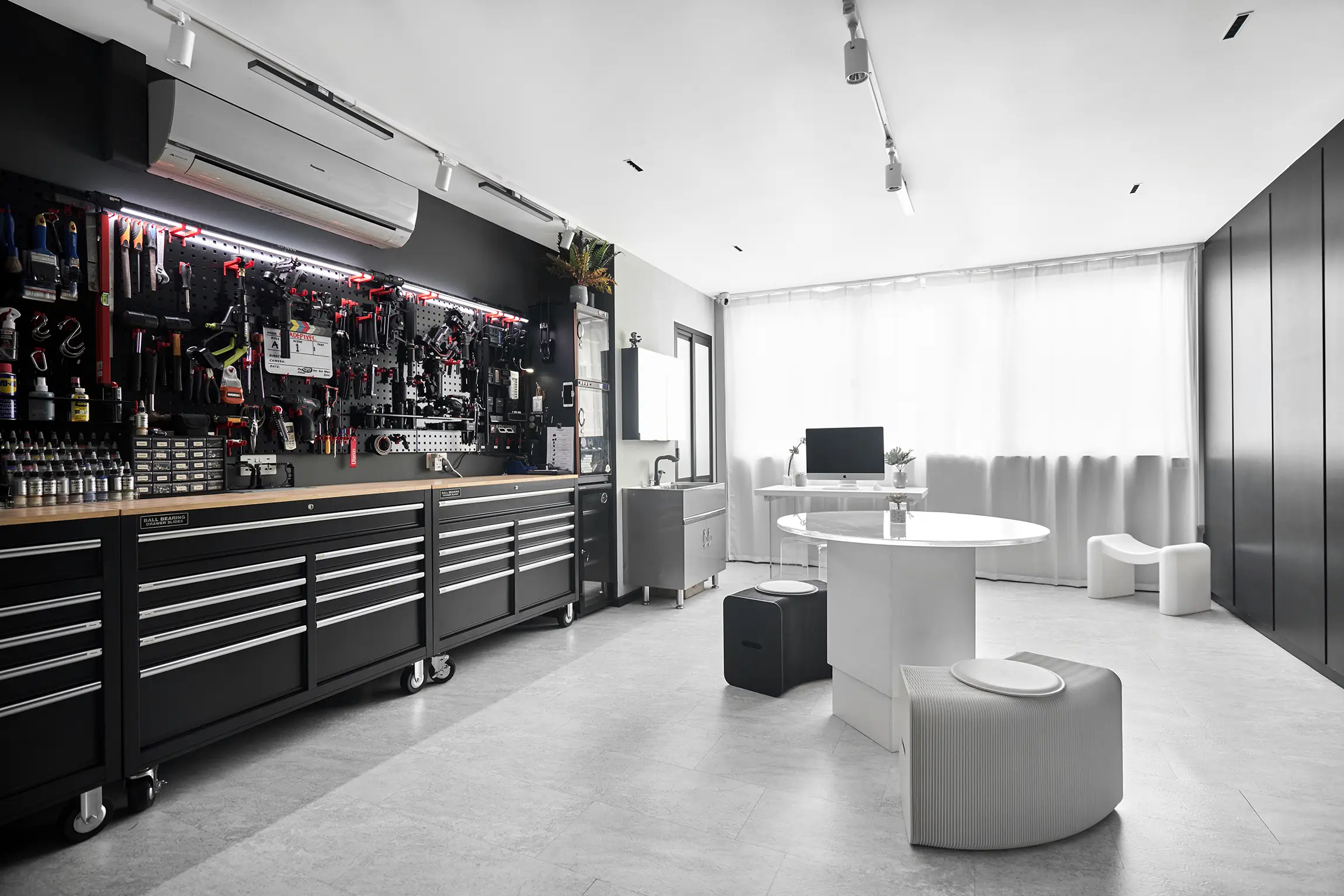 Our workshop space is where functionality meets creativity, designed to bring a modern, industrial touch to your shoots. This area is perfect for tech reviews, unboxing videos, and hands-on demonstrations. With a backdrop of wall-mounted tool panels and neatly stored gear, the workshop offers a stylish, practical setting that feels authentic and engaging.